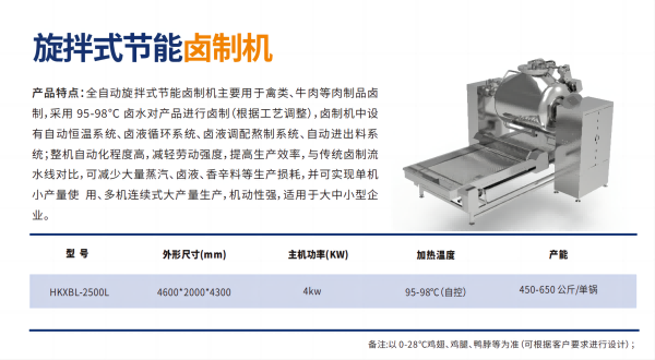全?動旋拌式節(jié)能?制機(jī)主要?于禽類、??等?制品?制,采? 95-98 °C ??對產(chǎn)品進(jìn)??制(根據(jù)?藝調(diào)整),?制機(jī)中設(shè)有?動恒溫系統(tǒng)、?液循環(huán)系統(tǒng)、?液調(diào)配熬制系統(tǒng)、?動進(jìn)出料系統(tǒng);整機(jī)?動化程度?,減輕勞動強(qiáng)度,提??產(chǎn)效率,與傳統(tǒng)?制流?線對?,可減少?量蒸汽、?液、??料等?產(chǎn)損耗,并可實(shí)現(xiàn)單機(jī)?產(chǎn)量使 ?、多機(jī)連續(xù)式?產(chǎn)量?產(chǎn),機(jī)動性強(qiáng),適?于?中?型企業(yè)。